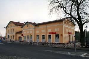 Etwa in der Mitte der Bahnhofstraße befindet sich einer der vier Bahnhöfe Strausbergs, der Bahnhof Strausberg (siehe Fotos vom Bahnhof).